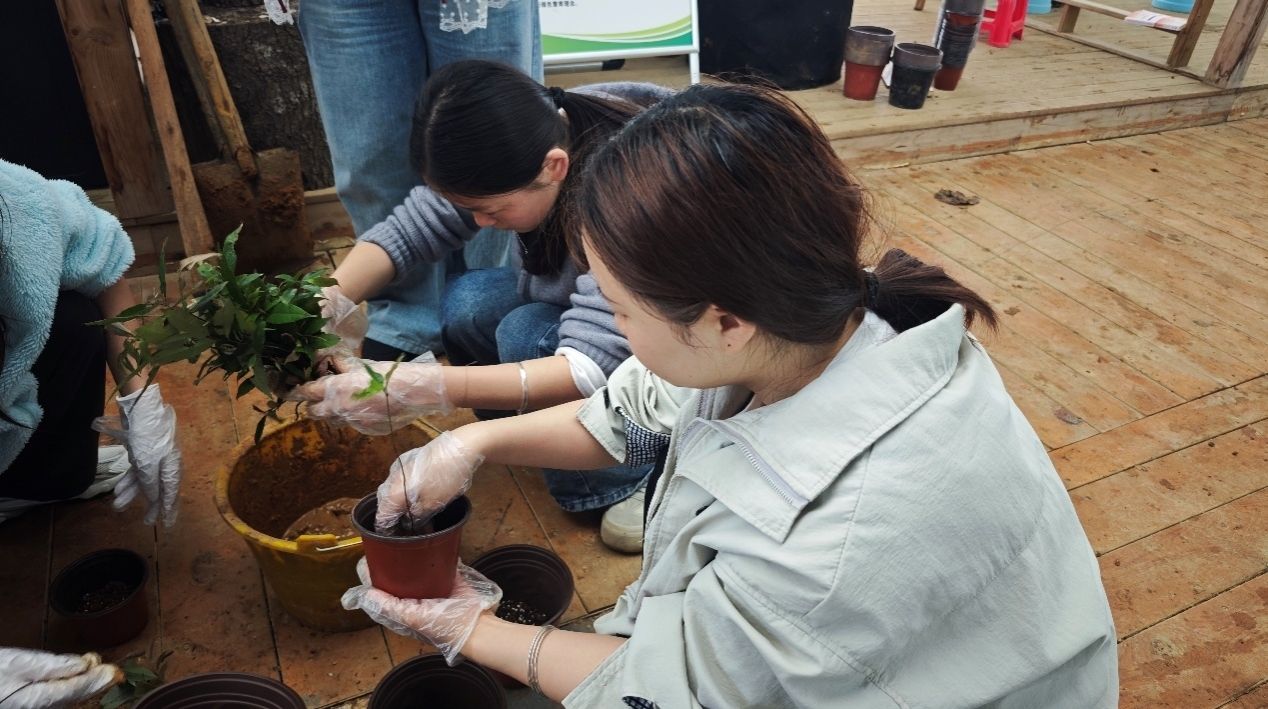 “以前在课本上学‘容器苗培育技术’,总觉得无法理解,直到今天亲手给幼苗上盆才发现,连盆土的松紧度都会影响幼苗成活。”学生一边将表土填入育苗盆,一边说道。与理论课上对着教材背诵“根系舒展”“土壤贴合”等概念不同,此刻的学生们能清晰感受到盆土质感,能直观看到幼苗根系在盆中的状态,每一个操作细节都变得清晰明了。从盆土配制时的基质混合,再到盆栽种苗,学生们在教师带领下全程参与盆栽育苗栽植环节,将课本上的文字转化为指尖的实操技能,真正实现了“懂理论、会实操”的能力融合。