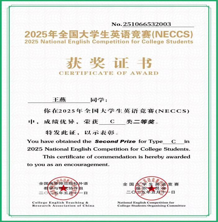 在校期间,她始终保持着踏实严谨的学习态度,专业基础扎实,学习成绩稳定。注重英语能力的提升,顺利通过了英语四六级考试,并先后获得全国大学生英语竞赛C类二等奖、全国大学生英语翻译大赛一等奖,展现了良好的语言素养。同时,她也主动参与植物标本采集、实验技能训练等科研实践,为后续的专业学习打下了坚实基础。