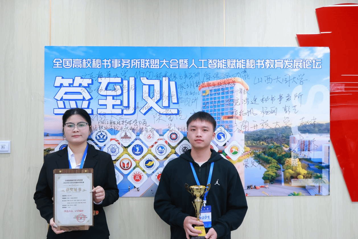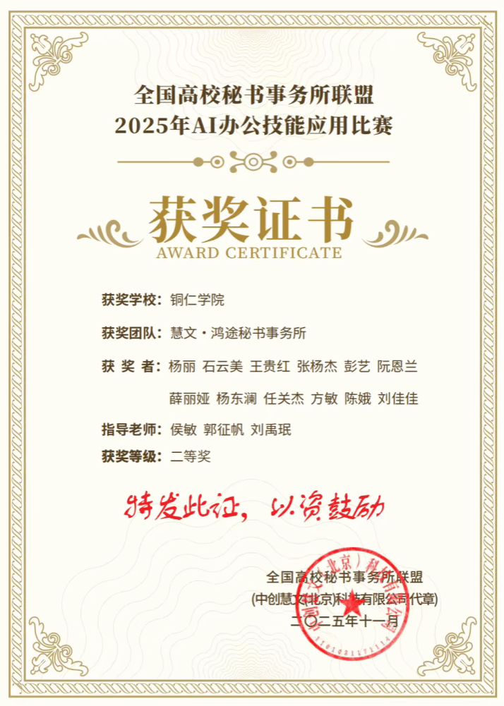 11月29日,2025年全国高校秘书事务所AI办公技能应用比赛颁奖仪式在全国高校秘书事务所联盟大会上圆满落幕。铜仁学院慧文·鸿途秘书事务所荣获本次比赛二等奖。