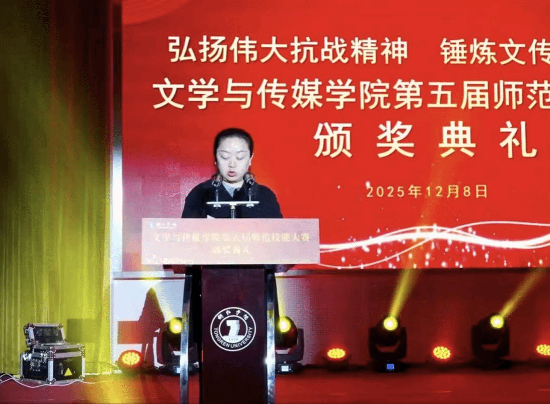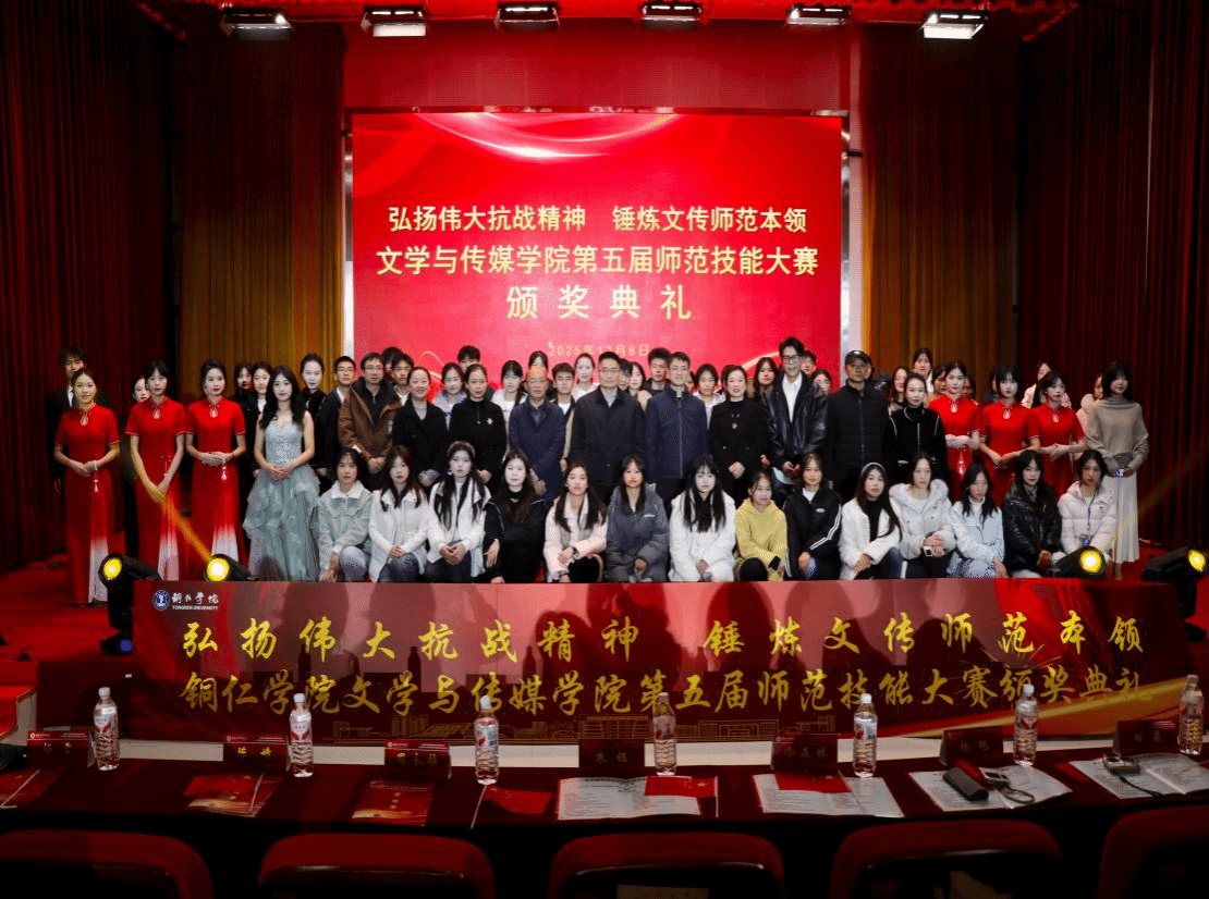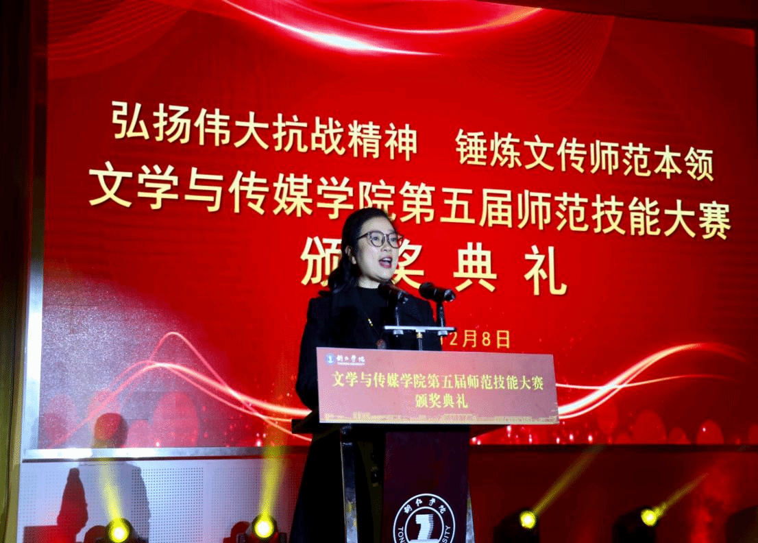 弘扬伟大抗战精神,锤炼文传师范本领。12月8日,我院第五届师范技能大赛颁奖典礼在人文生态馆举行,标志着历时近一个月的师范技能大赛圆满落幕。铜仁学院党委副书记朱钰,校党委常委、党委宣传部部长、校党政办公室主任周永雄,教务处处长冷森林,文学与传媒学院党委书记杨艳,党委学工部副部长陈婧、校团委副书记田淼,文学与传媒学院党委副书记杨雪、副院长张建刚出席典礼,我院全体师生共同见证这一荣耀时刻。