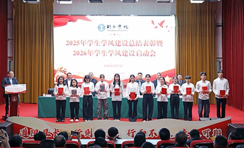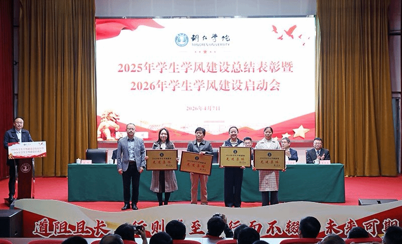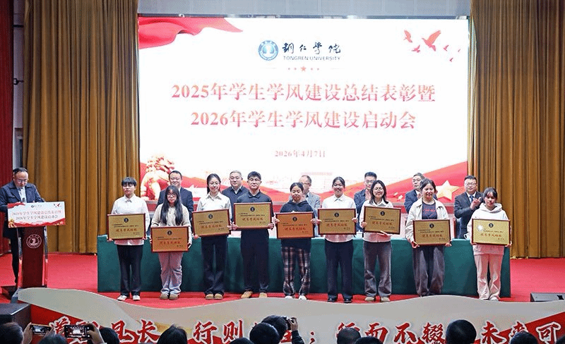 4月7日,铜仁学院2025年学风建设总结表彰暨2026年学风建设启动会在生态人文馆召开,我院斩获多项荣誉。此次学风建设工作表彰中,我院“人文浸润,砺学砺行”学风建设品牌得到学校充分肯定,获评“2025年学风建设先进集体”;2024级秘书学班获评“优良学风班级”荣誉称号;周晓彤等12名同学获评“学习标兵”荣誉称号。