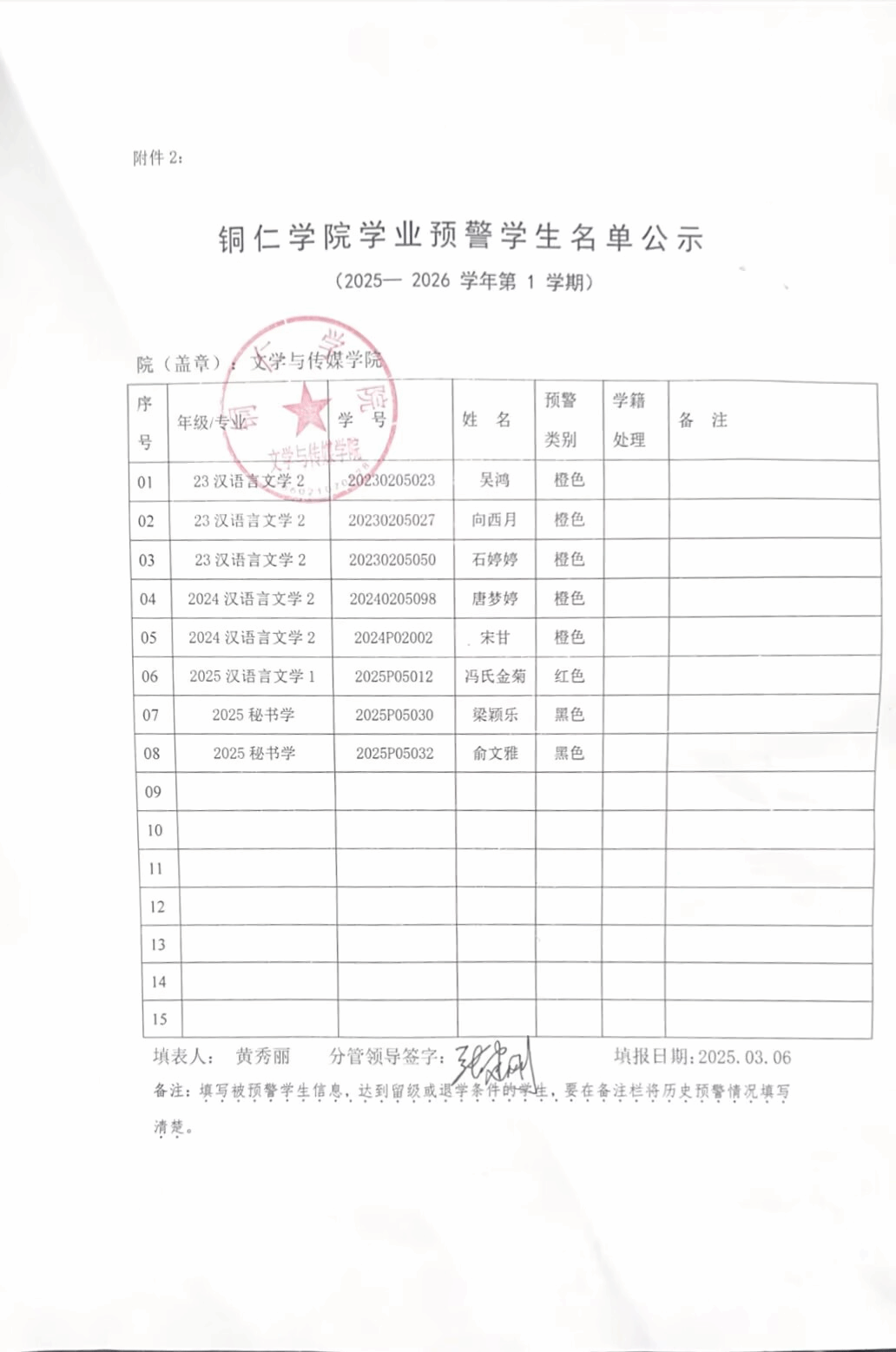 铜仁学院2025—2026学年第1学期学业预警名单公示