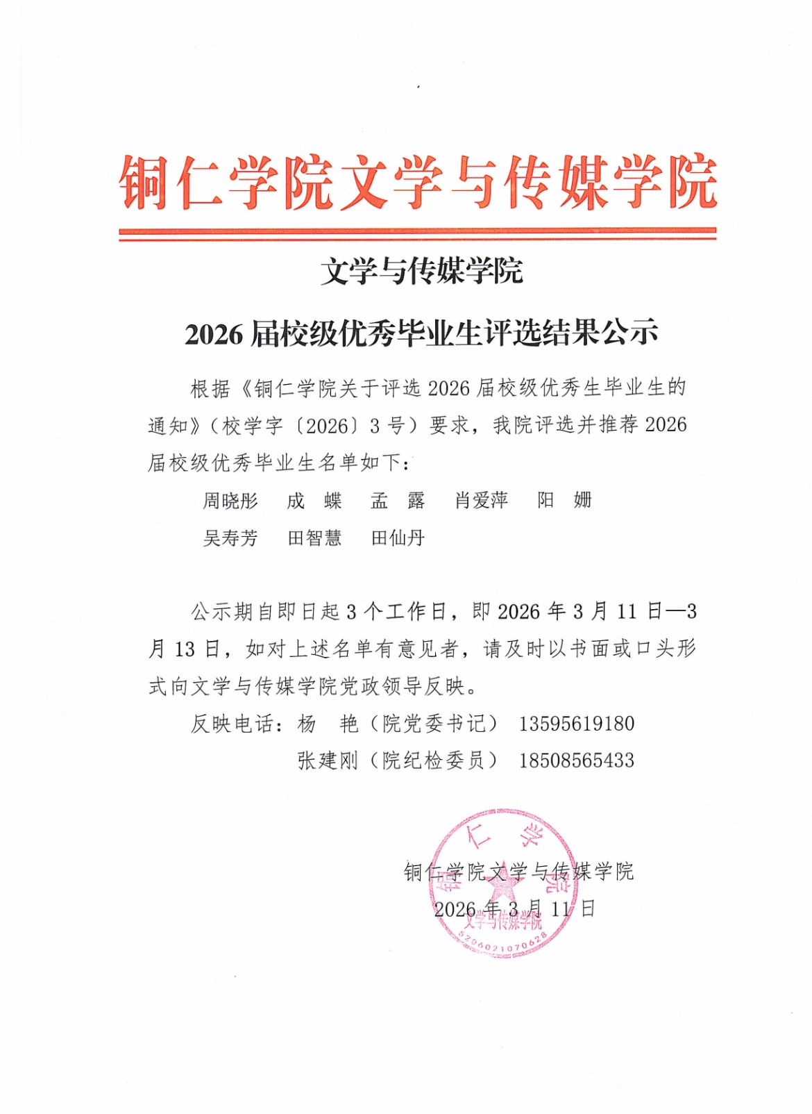 文学与传媒学院2026届院级优秀毕业生评选结果公示