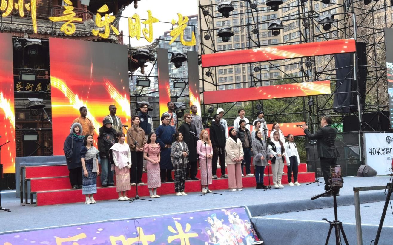这是一支来自14个国家的国际生组成的合唱团,以独特的跨国阵容成为全场焦点。走进活动现场,能清晰感受到多元文化碰撞的鲜活气息。不同肤色的学生并肩站在红色舞台上,虽带着赛前的些许紧张,却难掩眼中对音乐的热忱。他们中有人身着家乡特色服饰,有人搭配了简约的休闲装。形象各异的装扮背后,是整齐划一的演唱姿态。当伴奏声响起,尽管母语不同,他们却用流利的中文演唱《送别》,优美的旋律和歌声在古色古香的舞台建筑与多彩灯光的映衬下回荡。既有国际范儿的灵动,又融入了贵州本土音乐的醇厚韵味,现场工作人员与观众不时传来阵阵赞叹。