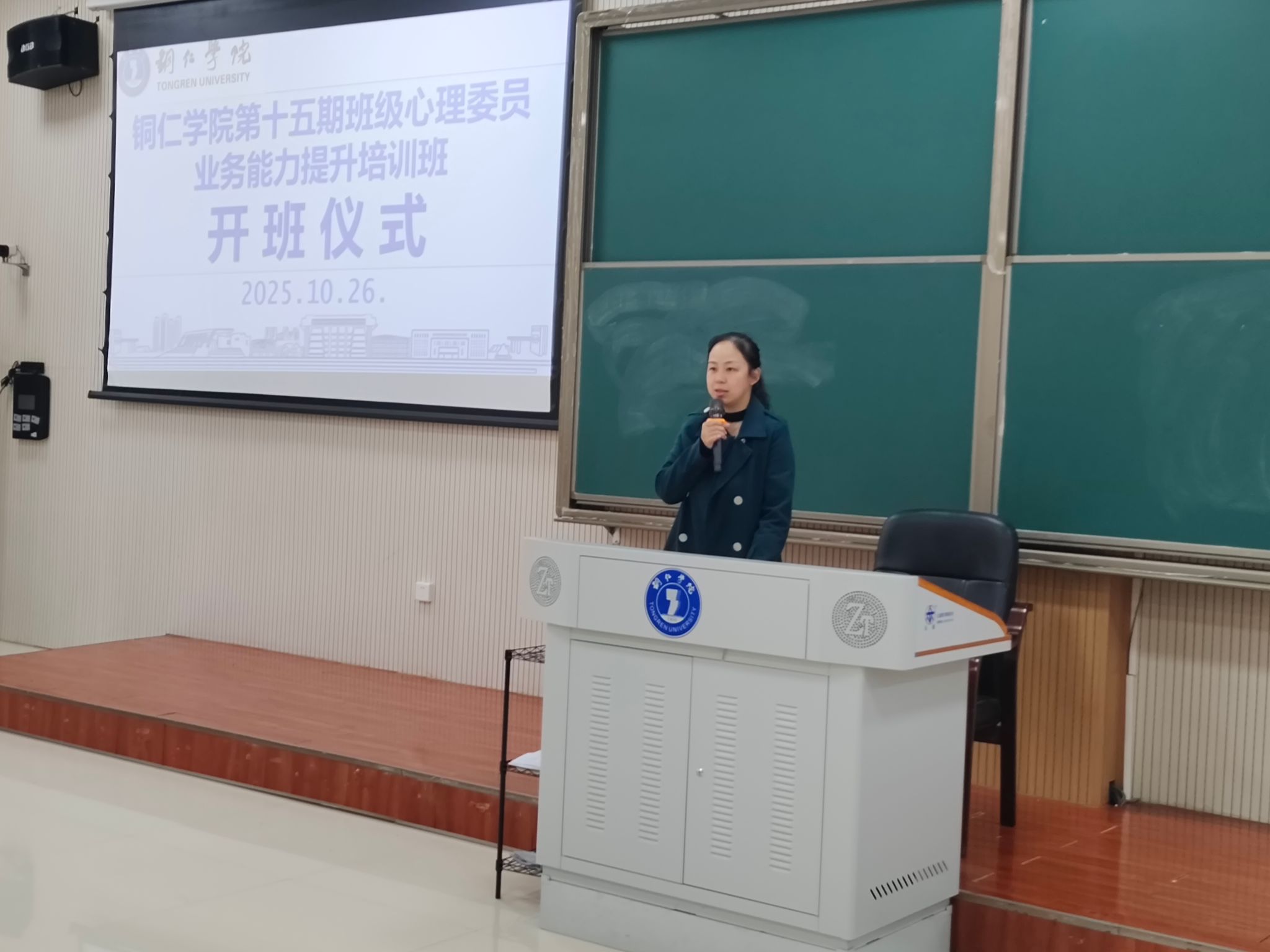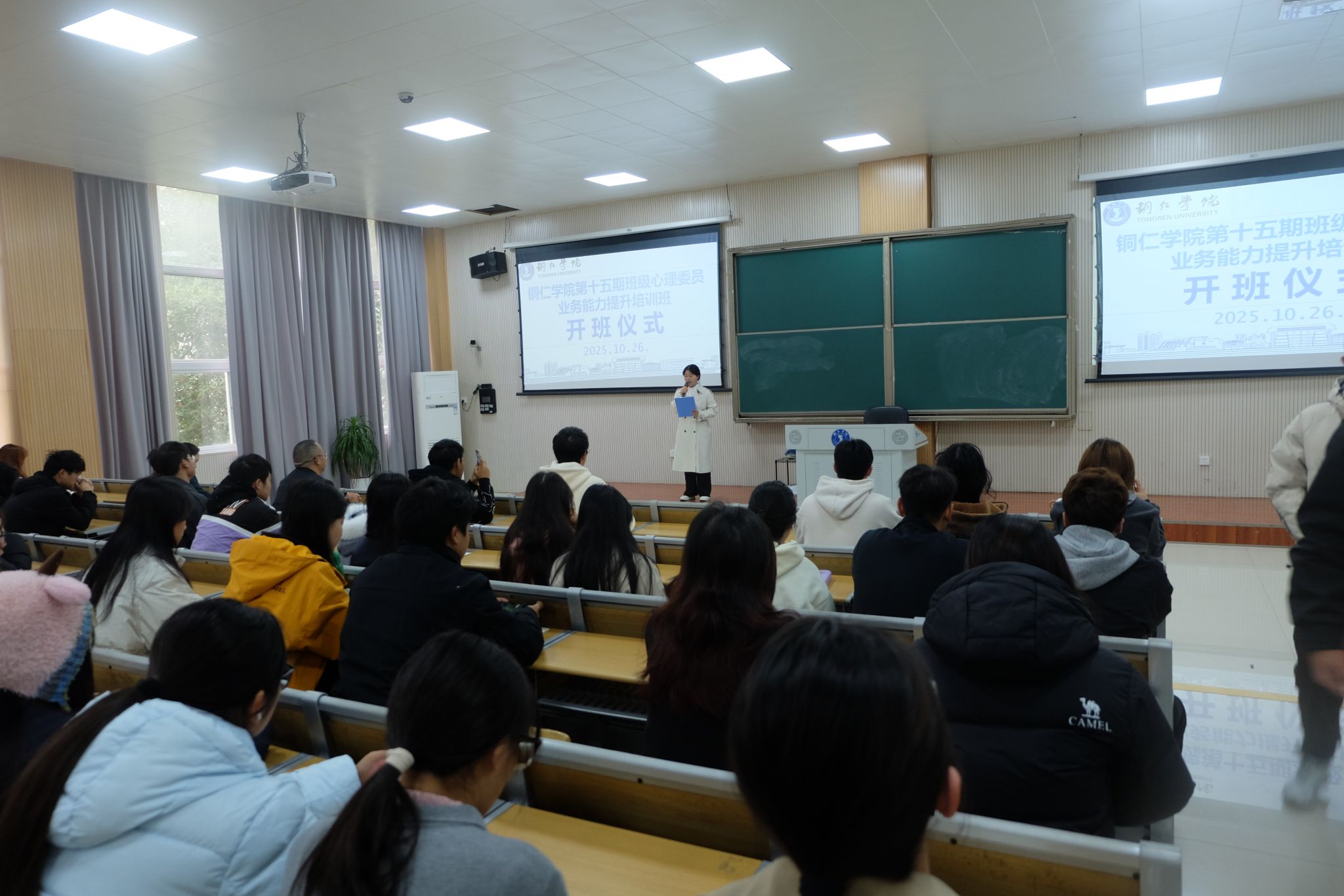 10月26日上午,我校第十五期班级心理委员业务能力提升培训班开班仪式在博思楼102教室举行。校党委学生工作部副部长陈婧出席并讲话,心理健康教育中心主任宋健出席并为培训班授课,全校150余名班级心理委员参加开班仪式,仪式由校阳光心理服务队徐艳同学主持。