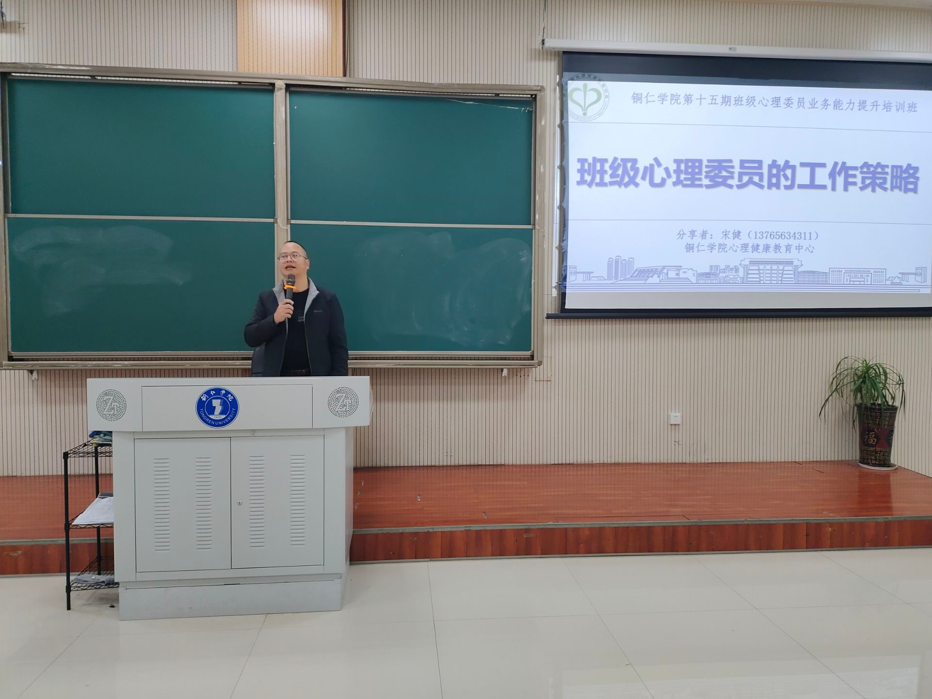 合影结束后,宋健作了题为《班级心理委员的工作策略》的培训讲座。他首先向大家介绍了担任班级心理委员应该具备的基本素养和班级心理委员的工作职责,随后他通过分享班级心理委员“12345工作法”,并结合自身十多年的心理健康教育工作经验与实际案例,深入解读该工作法的应用要点,帮助同学们更透彻地掌握方法精髓。