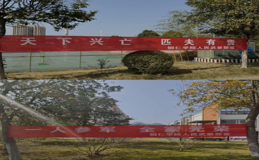 活动现场,气氛火热。铜仁学院大学生征兵政策咨询点上,担任“政策讲解员”的退役复学学生身着军服,向围拢的同学热情细致地讲解入伍流程、学费补偿、复学安置等入伍需知。展架上“明德铸军魂,致用续青春”“毕业了去当兵”等标语醒目亮眼。同时,学校各处LED屏滚动播放着“携笔从戎锤炼男儿本色,建功军营忠诚报效祖国”等宣传语,校园道路两侧悬挂着“天下兴亡 匹夫有责”“一人参军 全家光荣”的横幅。校园内,征兵宣传氛围浓厚。