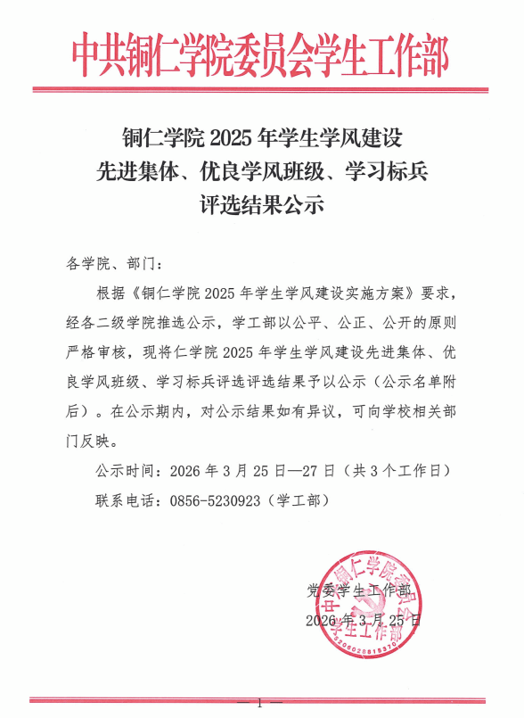 铜仁学院2025年学生学风建设先进集体、优良学风班级、学习标兵评选结果公示