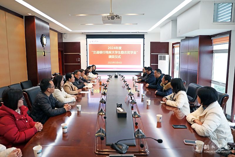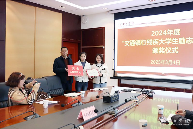 3月4日上午,我校举行“交通银行残疾大学生励志奖学金”颁奖仪式。铜仁市残疾人联合会党组成员、副理事长罗会鹏,市教育局特教专干石彩虹出席并为何心月同学颁发了获奖证书和奖金。我校党委学工部部长张钱及相关人员、教育学院党委书记崔德虎及部分师生代表,市教育局、市特殊教育学校相关人员参加了颁奖仪式。