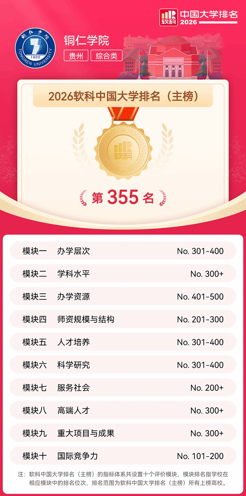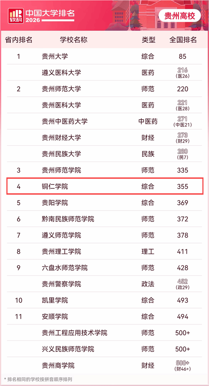 4月15日,高等教育专业评价机构软科正式发布“2026软科中国大学排名”,铜仁学院排在主榜第355位,较2025年上升了24个位次。
