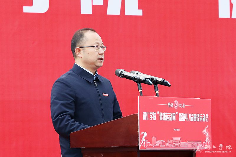 开幕式在庄严肃穆的国歌声中拉开帷幕。潘学军致辞,代表学校向运动会的胜利开幕表示热烈祝贺,向全体工作人员、运动员、裁判员致以诚挚问候。他指出,我校举办了47届校运会,这伴随着一代代铜院学子的成长。他寄语全体师生,要在赛场上锻造苦心励志的韧劲、开阔团结协作的胸襟、彰显躬行实干的担当,践行“更快、更高、更强、更团结”的体育精神,传承“苦心励志·追求卓越”的铜院精神,收获真正的成长。