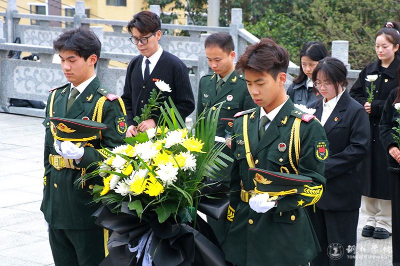 烈士纪念碑前,师生列队肃立,集体默哀、鞠躬致敬,深切悼念为民族独立、人民解放和国家富强英勇献身的革命先烈。