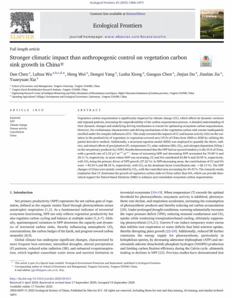 近日,我校农业(农村发展)硕士研究生陈丹,在SCI期刊《Ecological Frontiers》(JCR Q1区,中科院3区,IF=4.7)上发表学术论文“Stronger climatic impact than anthropogenic control on vegetation carbon sink growth in China”,深入评估了气候变化和人类活动对中国植被碳汇的影响。该论文于2025年11月4日正式发表,陈丹为第一作者,吴路华教授为通讯作者。
