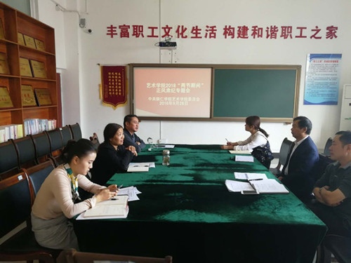 9月28 日上午,我院在党员活动会议室召开2018年“两节期间”正风肃纪专题会议。会议由艺术学院党委书记崔德虎主持。艺术学院院长李洁、副院长谢云中、党政办主任麻晔斐、科研科科长戴腾、学生科科长龙黎、院纪检委员王中、团总支书记张少涛、美术与设计系主任龙庆华、音乐与表演系主任罗亚琴参会。