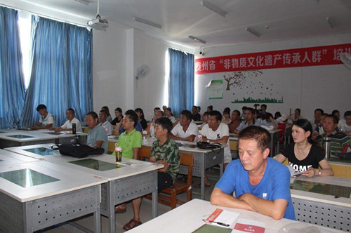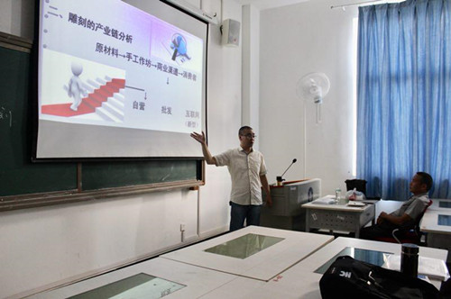 2018年8月21日,铜仁学院非遗传承人培训开班的第二天。下午2:30,艺术学院副院长、副书记谢云中教授,对非遗培训刺绣班从色彩基础理论、色彩的意义、产品色彩设计等方面结合刺绣的配色特点就《色彩基础》进行了详细的讲解。使学员们对色彩概念、色彩属性、色彩情感表达有全新认识,丰富了学员基础理论知识,为非遗传承与创新发展奠定了较好基础。 艺术学院美术与设计系专业教师陈宏江老师针对传统雕刻的手工艺现状及发展,与参加培训的手工艺人们共同就《雕刻工艺市场发展趋势》进了市场前景和发展趋势分析讨论,使参与培训的传承手工艺人们就本身行业的发展和前景,有了比较清楚的人生增强了信心。