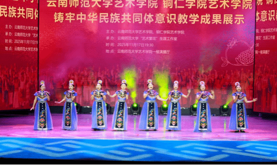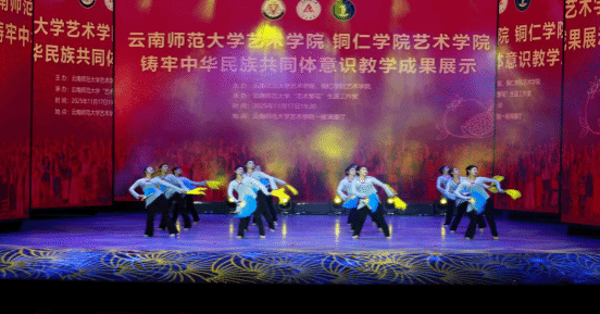 当《摆出土家幸福来》的欢快舞步与《十大姐》的傣家风情在舞台交织,一场联结黔东民族魂与滇南艺术美的联合音乐会,2025年11月17日晚在云南师范大学温情启幕。作为铜仁学院艺术学院“民族艺术活化”工程的年度重点交流项目,本次演出不仅是两校学子专业实力的集中展示,更以黔滇民族艺术为纽带,搭建起跨地域文化对话的桥梁,让土家摆手舞、苗族山歌的黔东韵律,与傣族舞蹈、彝族弹拨乐的滇南风情,在旋律与舞步中碰撞出独特火花。音乐会开场,云南师范大学艺术学院石榴籽舞蹈团带来的《十大姐》率先登场,傣家少女的灵动舞姿如清泉淌入舞台,而我院学子紧随其后的《摆出土家幸福来》,则以一根嵌有铜钱的长杆为道具,手持杆身,通过拍、打、摇、转等动作让铜钱发出清脆声响,同时配合摆手、扭腰等土家舞蹈步伐,瞬间点燃现场氛围——这既是两校艺术风格的首次呼应,更暗合了“黔滇民族艺术同源共生”的文化脉络。